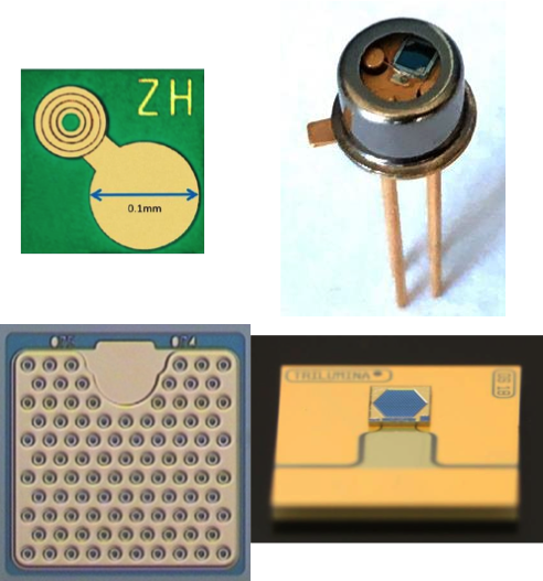 除了上面的基本知識,這些與LED技術(shù)相似的制程術(shù)語你也必須知道,我在此不再多解釋,他們是MOCVD(有機氣相外延沉積)與MBE(分子束外延)外延技術(shù),光刻技術(shù)決定芯片圖形與尺寸,ICP-RIE(電感耦合反應(yīng)離子刻蝕)技術(shù)刻蝕出發(fā)光平臺(Mesa),氧化制程讓諧振腔定義出最佳的VCSEL光電特性,鈍化絕緣制程讓暴露的半導(dǎo)體材料不受空氣與水汽影響可靠度,最后研磨與切割變成一顆顆芯片,再進行測試與出貨給封裝廠,由于結(jié)構(gòu)上跟紅黃LED芯片類似,是上下電極垂直結(jié)構(gòu),所以一般是先測試芯片特性再進行切割與最后分選。圖三就是VCSEL的芯片與封裝示意圖,做LED的人有沒有似曾相識的感覺呢?